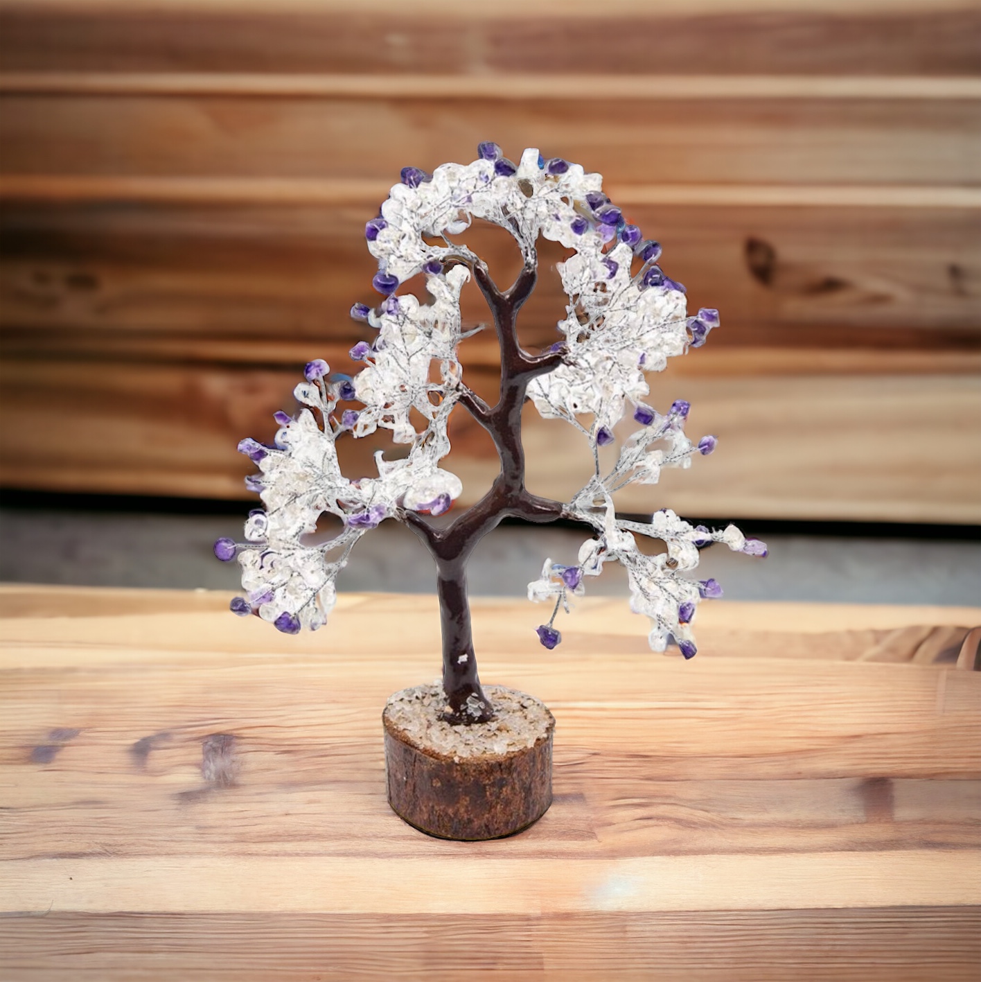 De Boom van Amethist en Bergkristal is een betoverend decoratief item van 25 cm hoog, perfect voor het toevoegen van een spirituele en rustgevende energie aan elke ruimte. Deze prachtige boom is zorgvuldig vervaardigd, waarbij de blaadjes zijn gemaakt van edelstenen. De amethistblaadjes stralen kalmerende energie uit, terwijl de bergkristallen een reinigende en verhelderende werking hebben. Samen creëren ze een harmonieuze balans tussen rust, bescherming en helderheid.
