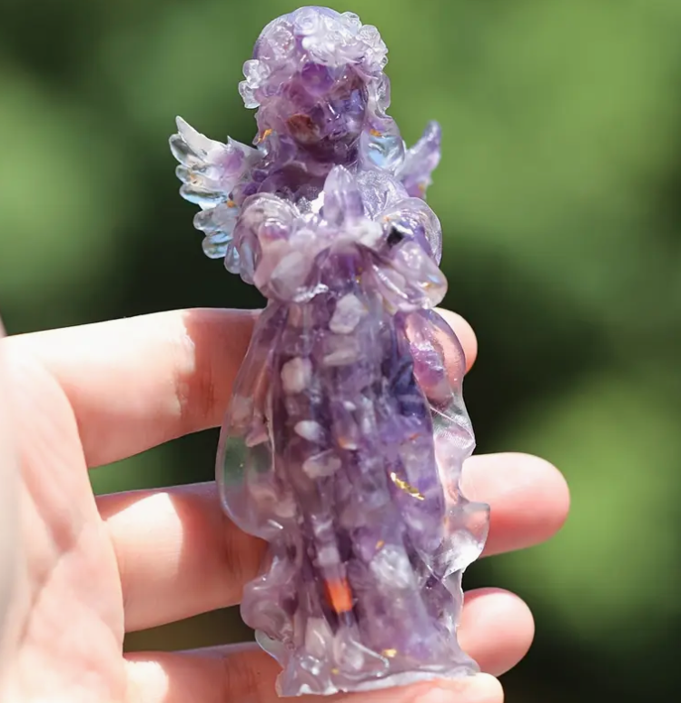Dit Engel Harsbeeldje Amethist is een liefdevol en spiritueel figuurtje van 9,5 cm hoog, met een zachte, biddende houding die een gevoel van rust en bescherming uitstraalt. Het beeldje is zorgvuldig gegoten en van binnen gevuld met amethist steentjes en glinsterend goudblad, wat zorgt voor een betoverende uitstraling.