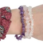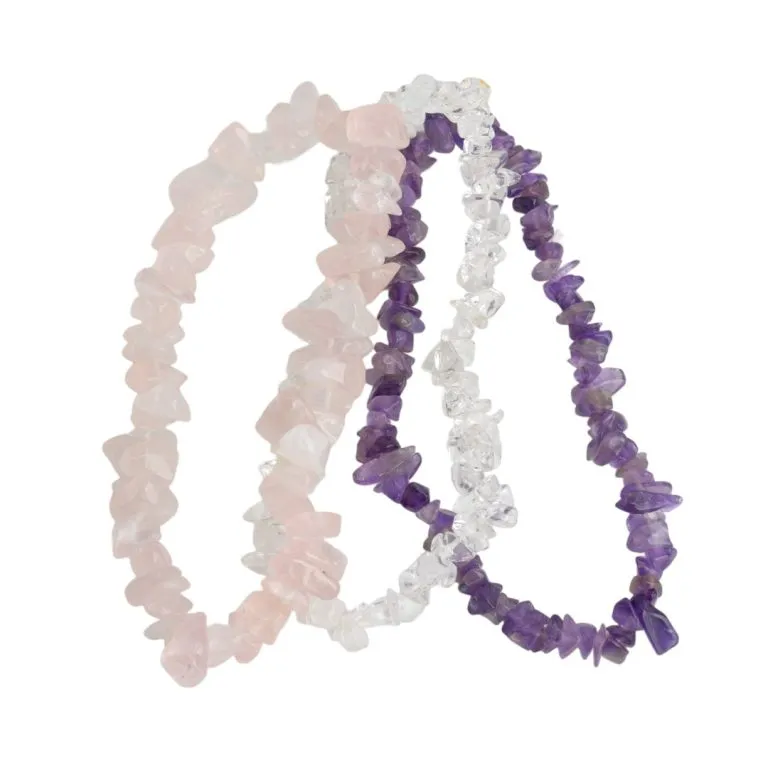 De Gouden Driehoek Chips Armbanden Set is een prachtige collectie van drie armbanden die de kracht en schoonheid van drie krachtige edelstenen combineert: Rozenkwarts, Amethist en Bergkristal. Deze set is ontworpen om niet alleen je pols te sieren, maar ook om je energie in balans te brengen en je spirituele praktijk te ondersteunen. Elke armband is zorgvuldig samengesteld met chips van de edelstenen, die in een harmonieus ontwerp zijn geplaatst en versterkt worden door de gouden accenten die elegant door de stenen verweven zijn.
