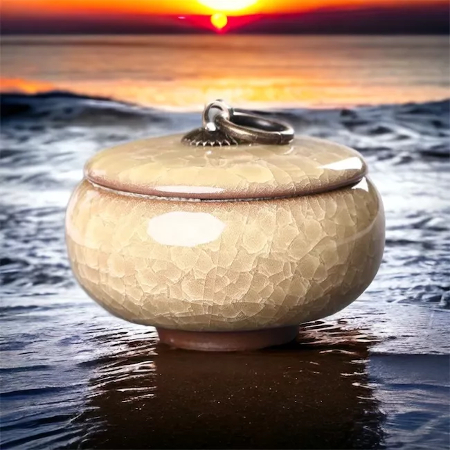 Deze prachtige keramische gele urn is een uniek stuk decoratie dat een mooie toevoeging is aan elke kamer. De urn is gemaakt van hoogwaardig keramiek en heeft een glanzende gele glazuurlaag. De urn heeft een klassieke vorm met een smalle bovenkant en een brede onderkant. De urn is 7 cm hoog en 5 cm breed.