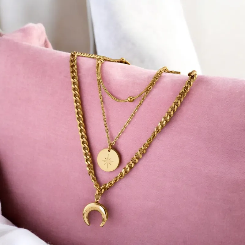 Het subtiele maantje aan de langste ketting voegt een spiritueel element toe aan het geheel, symbool voor mysterie en vrouwelijkheid. Of je nu op zoek bent naar een sieraad voor een speciale gelegenheid of gewoon je dagelijkse look wilt verrijken, deze drielaagse ketting biedt de perfecte combinatie van stijl, spiritualiteit en duurzaamheid.